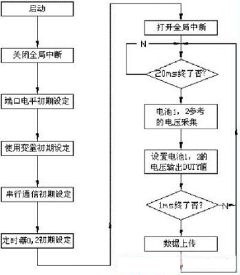 為了驗(yàn)證本文的均衡充電方法,以兩節(jié)單體電池組成的蓄電池組為例進(jìn)行實(shí)驗(yàn)和分析,主要驗(yàn)證旁路中開關(guān)管對電壓的調(diào)節(jié)作用。控制流程見圖4。