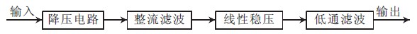 本設(shè)計(jì)由降壓模塊、整流濾波模塊、線性穩(wěn)壓模塊和低通濾波模塊組成, 如圖1 所示。變壓器將220 V/50 Hz 交流電分別降壓到±16 V、±6 V、+6 V, 通過整流橋堆整流以及大容量電容濾波后, 進(jìn)入正( 負(fù)) 線性穩(wěn)壓模塊, 再經(jīng)過低通濾波模塊濾除直流以外的干擾信號, 分別輸出±15 V、±5 V、+5 V 的穩(wěn)定電壓。