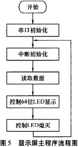 由單片機(jī)控制LED的亮滅和無線數(shù)據(jù)的接收.數(shù)據(jù)通過無線模塊接收后,單片機(jī)的串行接口收到數(shù)據(jù)并傳到主控芯片AT89S8252中處理,當(dāng)有無線數(shù)據(jù)傳到時(shí),優(yōu)先處理接收數(shù)據(jù).顯示屏主程序流程圖見圖5。無線數(shù)據(jù)接收子程序流程圖見圖6。顯示屏能否清晰顯示內(nèi)容主要從以下幾方面考慮:1)單片機(jī)控制LED的亮滅時(shí)間:T=S/V,S為LED面寬度,為電機(jī)轉(zhuǎn)動(dòng)線速度;2)電機(jī)轉(zhuǎn)動(dòng)時(shí)軸心保持平衡;3)環(huán)境光線對比度。