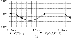 由圖4可知,當(dāng)開關(guān)導(dǎo)通時,開關(guān)電壓V(M1:d)(Vds)下降,由于電感Lr的作用,電流不能突變,使得開關(guān)電流is在開關(guān)電壓V(M1:d)(Vds)降到零后,才從零開始上升,實現(xiàn)了開關(guān)的零電流導(dǎo)通。當(dāng)開關(guān)關(guān)斷時,由于電容Cs的鉗壓作用,開關(guān)電壓從低電壓上升,基本實現(xiàn)零電壓關(guān)斷。而電感電流iLr和電壓vcr波形與理論分析的是一致的。
