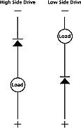 對于將大功率MOSFET用于各種負載的固態(tài)開關(guān)動作的電子模塊,其他極性接反的情況主要集中在驅(qū)動配置的高壓側(cè)或低壓側(cè)(見圖3a)。在極性接反的狀態(tài)下,大功率MOSFET的內(nèi)在二極管變?yōu)檎蚱?,并允許電流能夠流至與其連接的電機、燈或電磁閥負載(見圖3b)。
