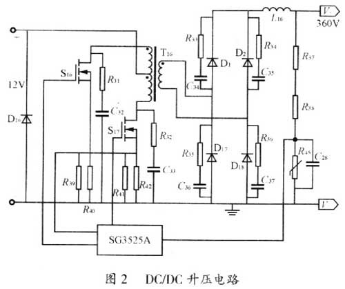 其工作原理為將升壓變壓器的中心抽頭接于正電源,兩路相反的PWM驅(qū)動脈沖送至開關管S16、S17的基極,從而控制兩只功率管交替工作,得到的方波交流電壓經(jīng)變壓器輸出,經(jīng)電感L16和電容濾波得到360V直流。電流檢測電阻(R41//R42)得到的電壓接到SG3525A的腳10來實現(xiàn)過流保護。R37、R38和R45為電壓采樣,構(gòu)成電壓負反饋,因而提高了電路的可靠性。SG3525A及控制電路的電源都來自蓄電池,D16為防反接二極管。DC/DC從12V蓄電池電壓升到360V直流電,供后級鎮(zhèn)流電路點燈。