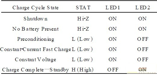 表1MCP73831電路設(shè)計(jì)中指示燈的邏輯關(guān)系