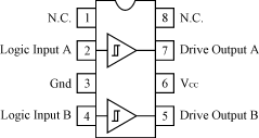 MC34152的外圍電路簡單,應(yīng)用方便。它是8管腳的同相推挽驅(qū)動芯片,具體的內(nèi)部結(jié)構(gòu)和封裝如圖4所示。腳2與腳4為兩路控制信號輸入,經(jīng)過芯片內(nèi)部的推挽放大,直接輸出同相的兩路驅(qū)動信號(腳7及腳5)。為使芯片更加穩(wěn)定地工作,一般在芯片的電源端并聯(lián)一個濾去高頻干擾的瓷片電容和一個濾去低頻干擾的電解電容。
