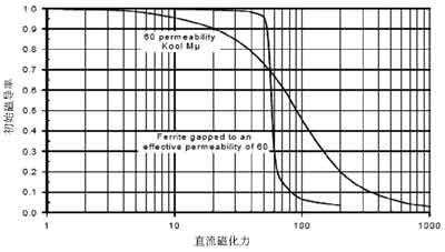 此外,電感磁芯材料也是選擇電感時應該加以考慮的重要因素。常用的磁芯材料分為兩大類,一類是粉狀磁芯,以鐵粉芯、High Flux高磁通磁粉芯以及Kool Mμ為代表;另一類是鐵氧體磁芯。兩種磁芯材料各有優(yōu)缺點,設計人員在選擇的時候,應根據(jù)成本、性能、尺寸等因素綜合考慮進行選擇。相對粉狀磁芯電感,鐵氧體磁芯的電感具有較低的磁芯損耗,同時具有較高的開關頻率(高達MHz)。因此,鐵氧體磁芯通常是此類應用的最佳選擇。當然,鐵粉磁芯也有其優(yōu)越性,例如鐵粉磁芯的成本相對鐵氧體要低得多;另外,粉狀磁芯的電感隨著流過電感的直流偏置電流的變大要下降得緩慢些,相當于具有“軟”飽和特性,而鐵氧體磁芯的電感值在飽和以后就會迅速下降(見圖1),因此在設計的時候需要留有更多的余量,防止電感出現(xiàn)飽和。如圖1所示,粉狀磁芯的電感值隨著負載電流的增大下降相對緩慢。鐵粉磁芯往往是用于一些對功耗要求不甚敏感,開關頻率也不高(<200kHz),但注重成本的應用場合。