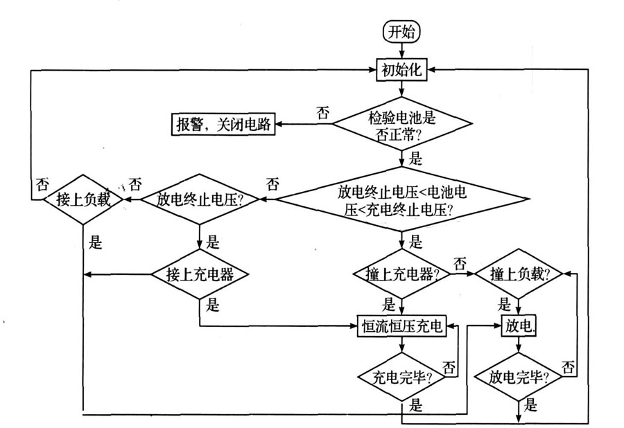 程序開始執(zhí)行后, 首先進行初始化并檢測電池電壓、電流、溫度等信息是否正常。 如正常則進入下一步。 否則報警并關(guān)閉電路。 如果電池電壓在充電終止電壓和放電終止電壓之間, 說明電池既可充電也可放電。 此時電路將判斷接上充電機還是接上負載。 以進行相應的充電和放電。 如果兩者都沒有接則循環(huán)檢測過程。 若電池電壓已經(jīng)到達充電終止電壓。 則等待負載的接入進行放電;同樣若電池電壓己經(jīng)達到放電終止電壓,則等待充電器的接入以進行充電。 在整個過程中,該電路將始終實時檢測電池信息,若有異常情況發(fā)生,則立即利用中斷信號終止正在進行的充電或者放電過程,關(guān)斷充放電回路,同時進行報警并提示報警原因。