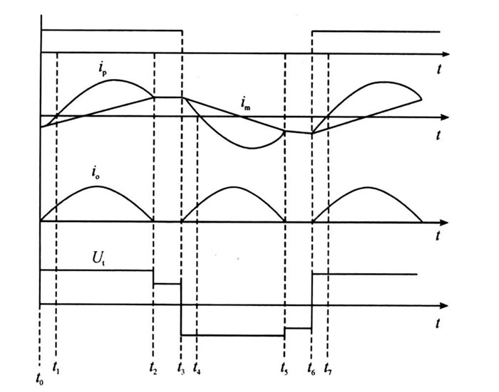 在下半個周期中, 電路的工作與上半個周期剛剛相似,只是方向相反。整個周期的電路工作波形:在上半個周期中,開關(guān)管Q1 為零電壓導通, 而Q1 在t3 時刻的關(guān)斷電流im 很?。?在下半個周期中,開關(guān)管Q2 為零電壓導通,而Q2 在t6 時刻的關(guān)斷電流im 很小,所以Q1 、Q2 工作時的開關(guān)損耗很小。