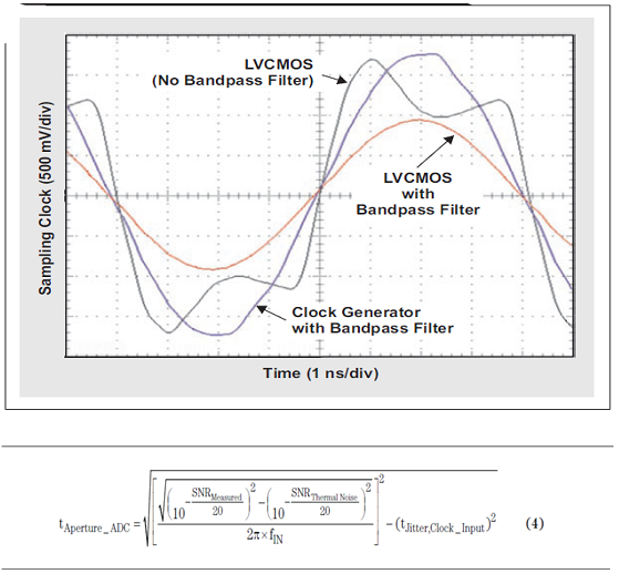 不匹配的原因是,計(jì)算得出的孔徑抖動是基于時(shí)鐘源生成器的快速轉(zhuǎn)換速率。CDCE72010 的 LVCMOS 輸出消除了時(shí)鐘信號的高階諧波,其有助于形成快速升降沿。圖 13 所示波形圖表明了帶通濾波器急劇降低未濾波 LVCMOS 輸出轉(zhuǎn)換速率,以及將方波轉(zhuǎn)換為正弦波的過程。