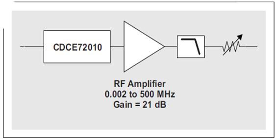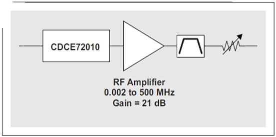 改善轉(zhuǎn)換速率的一種方法是:在 CDCE72010 的 LVCMOS 輸出和帶通濾波器之間添加一個(gè)具有相當(dāng)量增益的低噪聲 RF 放大器,參見圖 14。該放大器應(yīng)該放置于濾波器前面,這樣便可以將其對時(shí)鐘信號的噪聲影響程度限定在濾波器帶寬,而非 ADC 的時(shí)鐘輸入帶寬。由于下一個(gè)試驗(yàn)的放大器具有 21 dB 的增益,因此我們在帶通濾波器后面增加了一個(gè)可變衰減器,旨在匹配濾波后 LVCMOS 信號到時(shí)鐘生成器濾波后輸出的轉(zhuǎn)換速率。該衰減器可防止 ADC 的時(shí)鐘輸入超出最大額定值。