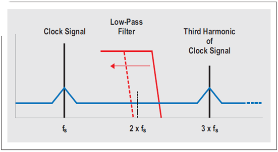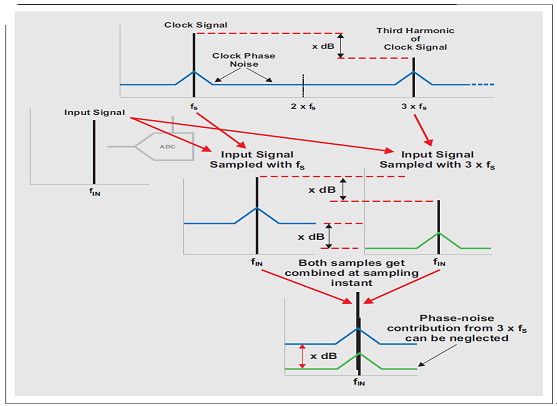 在采樣時(shí)間,基頻正弦波及高階諧波與輸入信號混頻,如圖 16 所示。(為了簡單起見,僅顯示了一個(gè)諧波。)因此,三階諧波周圍的相位噪聲與輸入信號混頻,而第三諧波也形成一個(gè)混頻結(jié)果。但是,由于時(shí)鐘信號的第三諧波的振幅更低,因此該混頻結(jié)果的振幅也被降低。