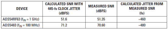 利用調(diào)節(jié)后的相位噪聲曲線圖,計(jì)算得抖動較好地匹配了 SNR 測量結(jié)果,其在 ADS54RF63 和 ADS5483 的 10 到 30 fs 范圍內(nèi)(參見表 8)??紤]到在第三諧波周圍可能存在相位噪聲的較小時(shí)鐘抖動影響,該計(jì)算得 SNR 只是一種非常接近的估算結(jié)果。