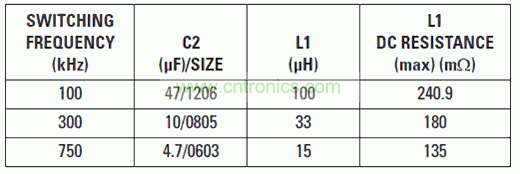 本例中,我們可以通過750-kHz開關(guān)頻率來產(chǎn)生一個5-V輸出電壓(參見表2)。但是,如果該頻率為1 MHz,則最低可能輸出電壓被限制為約6V;否則,DC/DC轉(zhuǎn)換器會跳過脈沖。替代方法是降低輸入電壓或者頻率。在選擇某個開關(guān)頻率以前,你最好是先查看DC/DC轉(zhuǎn)換器數(shù)據(jù)表,了解保證最小可控“導(dǎo)通”時間。