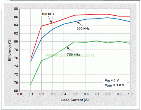 三個例子的重要損耗組成部分,來自于FET驅(qū)動損耗、FET開關(guān)損耗和電感損耗。FET電阻和IC損耗是一致的,因為所有三個設(shè)計中都使用了相同的IC。由于所有例子中都選擇了低ESR的陶瓷電容,因此電容損耗可以忽略不計。為了表明高頻開關(guān)的影響,我們對每個例子的效率都進行了測量,并將其顯示在圖2中。該圖清楚地表明,效率隨開關(guān)頻率增加而下降。若想提高所有頻率下的效率,需要尋找到一種全負載狀態(tài)下低漏到源“導(dǎo)通”電阻、低門電荷或者低靜態(tài)電流規(guī)范的DC/DC轉(zhuǎn)換器;或者尋找到一些具有更低等效電阻的電容和電感。