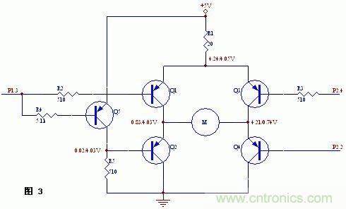 但實際實驗情況去出人意料,即電機正向和反向都不轉。經(jīng)測量,當P1.3高電平,P2.2和P2.4都為低電平時,Q4導通,但Q1不導通,P1.3的電平只有0.67V左右,這樣Q1無法導通。