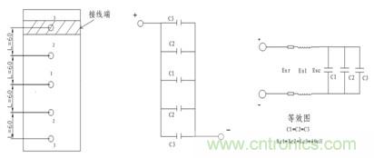(設(shè)2πf=ω)可知,當(dāng)頻率固定時,電感越大,感抗就越大。當(dāng)頻率較低時,例如在工頻50Hz時,電路中的雜散電感所產(chǎn)生的感抗Esl較低,遠小于 Esc,因此Esl可忽略不計,而其中的Esr和Esc占主要影響地位。但當(dāng)電流頻率高達600kHz時,則容抗較低,約0.005Ω/mm,感抗非常大,約0.3Ω/mm,遠大于Esc,在等效電路中占主要影響地位。若平均每1mm銅板的雜散電感約為1nH,而每個端子之間的距離為60mm,那么電路中總的雜散電感為60nH,而電容雜散為40nH,那么第一個電容的感抗為XL=40ω,第二個電容的感抗為XL=2Xl+Xc=160ω,第三個電容的感抗為:XL=4Xl+Xc=260ω。因為I=U/XL=200A,所以電流經(jīng)過這三個的比值為I1:I2=4:1,I1:I3=6.5:1,由此得出 1.4I1=200A而其中流經(jīng)C1的電流最大,約為143A,流經(jīng)C2電流約為36A,而流經(jīng)C3電流約為21A。因此C1電流發(fā)熱嚴重,而C2發(fā)熱正常,C3發(fā)熱較少,這樣容易令C1燒壞,所以不能采取此種連接方式。同時,在頻率比較低的情況下,比如工頻50Hz,外殼材料對產(chǎn)品影響不大。但在頻率達到10kHz或以上時,產(chǎn)品在使用過程中,外殼材料如果帶有磁性,那么其本身也會因為感應(yīng)加熱而發(fā)熱,從而對產(chǎn)品整體發(fā)熱產(chǎn)生不利影響。