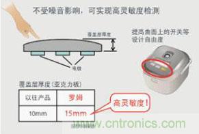 在靈敏度方面,通過獨創(chuàng)的高速采樣,使該產(chǎn)品在厚達15mm的覆蓋層中亦可使用。這使以往很難實現(xiàn)的在有一定厚度的圓形面板和曲面面板中應用觸控開關成為可能。