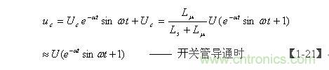【1-21】式是當(dāng)電源開關(guān)管Q1導(dǎo)通時(shí),分布電容Cs兩端電壓隨時(shí)間變化的表達(dá)式,它由兩部分電壓組成,一部分是電容Cs兩端電壓的半波平均值Uc ,由【1-19】式表示;另一部分是正弦阻尼振蕩,其最大振幅等于 Uc, e-at是一個(gè)小于1的衰減系數(shù)。