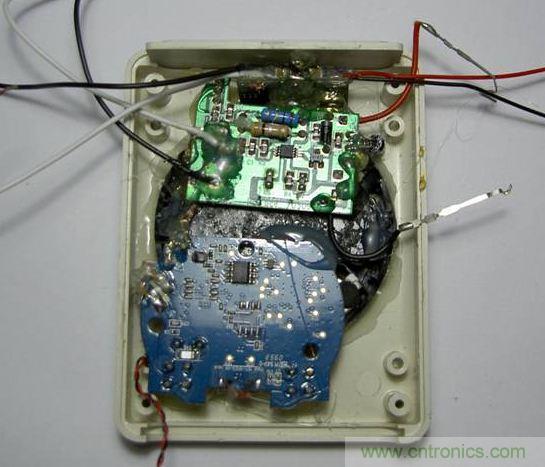 在這里我還在上蓋上鉆了兩個小孔制作了指示燈。我找了一直圓珠筆,筆桿是那種硬硬的透明的PE材料,我用電磨磨出剛好穿過小孔的細條,用打火機小心彎曲,把細條的另一端貼住電路板上的LED,將指示燈的燈光引到上蓋外面。然后用油料(橡皮泥)或者電工膠布包住led和細條,防止燈光干擾。最后用指甲銼將上蓋外突出來的筆桿銼平,用木片拋光,一切都很完美??上е谱鞯倪^程忘記照相了,還好下文可以看到做好的效果。
