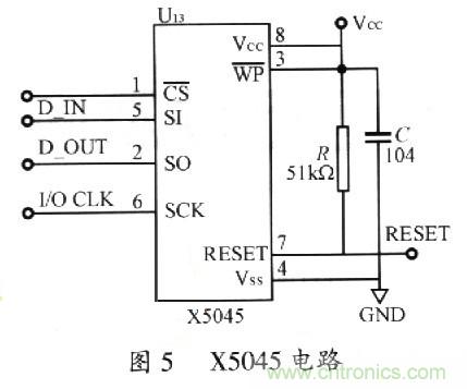 X5045電路的設(shè)計如圖5所示。本器件將四種功能合于一體:上電復(fù)位控制、看門狗定時器、降壓管理以及具有塊保護(hù)功能的串行EEPROM。它有助于簡化應(yīng)用系統(tǒng)的設(shè)計,減少印制板的占用面積,提高可靠性。將其與CPC以SPI總線方式連接,讀寫簡單,其內(nèi)部的EEPROM還可以保護(hù)一些重要數(shù)據(jù)。