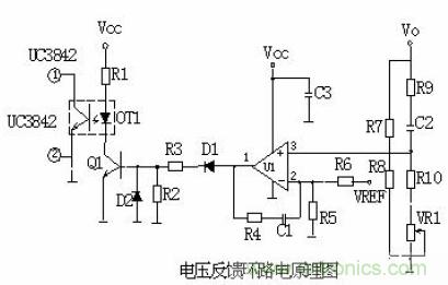 當(dāng)輸出U0升高,經(jīng)取樣電阻R7、R8、R10、VR1分壓后,U1③腳電壓升高,當(dāng)其超過U1②腳基準電壓后U1①腳輸出高電平,使Q1導(dǎo)通,光耦OT1發(fā)光二極管發(fā)光,光電三極管導(dǎo)通,UC3842①腳電位相應(yīng)變低,從而改變U1⑥腳輸出占空比減小,U0降低。