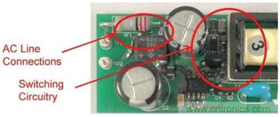 注意,漏極連接與輸入引線之間有一些由輸入電容器提供的屏蔽。該電容器的外殼連接至主接地,可為共模電流提供返回主接地的路徑。如圖2所示,這個微小的電容會導(dǎo)致電源EMI簽名超出規(guī)范要求。