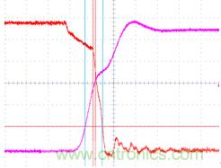 下面這種情況有非常多的人會忽視,甚至是一些比較有經(jīng)驗的電源測試工程師。下面組圖四是下管打開,上管關(guān)閉時候的波形(圖4-1是示意圖,圖4-2示實際測試圖)。雖然沒有被同時帶起的情況,但是請注意上下管有交叉的現(xiàn)象,而且交叉點的電平遠高于MOS管規(guī)定的Vth值,這是個嚴重的shoot through現(xiàn)象。最直接的后果就是MOS管燒毀!