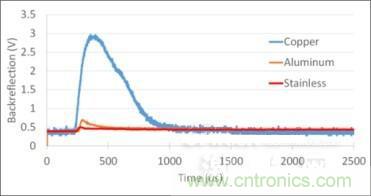 (圖片說明:在進(jìn)行不銹鋼、鋁和銅金屬板打孔時(shí)從工件返射的激光信號示例。)