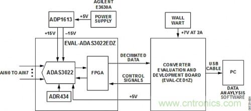 測試設(shè)置的功能框圖如圖4所示。ADP1613評估板由外部+5 V電源驅(qū)動,產(chǎn)生ADAS3022板所需的±15 V電壓。7 V直流壁式電源為EVAL-CED1Z板供電。EVAL-CED1Z板上的穩(wěn)壓器提供ADAS3022板所需的5 V電源。運行交流測試時,采用Audio Precision SYS-2702產(chǎn)生低失真輸入信號。