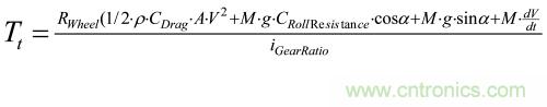 根據(jù)受力分析,我們可以推導(dǎo)出電動汽車行駛驅(qū)動力公式、驅(qū)動阻力公式、摩擦阻力公式、坡道阻力公式和加速阻力公式,進而可得到電動汽車的動態(tài)運動微分方程: