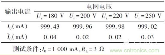 電源穩(wěn)定度測試數(shù)據(jù)如表1 所示。其中電源穩(wěn)定度是指在容許電網(wǎng)波動(dòng)范圍條件下,對輸出電流穩(wěn)定度的影響。測試條件為I0 =1 000 mA,RL =3Ω,測試數(shù)據(jù)表明電網(wǎng)電壓在180 V ~250 V 波動(dòng)時(shí),輸出電流最大偏差為0.99 mA,紋波電流小于0.05 mA,輸出電流和紋波電流均達(dá)到設(shè)計(jì)要求。