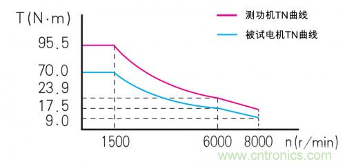 而要模擬被試電機(jī)的實(shí)際運(yùn)行工況,那測功機(jī)的加載能力,必須覆蓋被測電機(jī)的全部工況范圍,那才能滿足模擬“所有工況”的要求。簡單來說,就是測功機(jī)的機(jī)械負(fù)載的TN曲線,必須覆蓋被試電機(jī)的TN曲線,這樣才能把被試電機(jī)的全程TN特性測試出來。