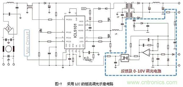 圖-7是LCC拓?fù)浣Y(jié)構(gòu),采用次級(jí)電流采樣做恒流反饋,并能實(shí)現(xiàn)0-10V調(diào)光的示意電路。PFC開(kāi)關(guān)管采用了英飛凌的高性價(jià)比P6系列CoolMOSTM IPD60R190P6,LCC開(kāi)關(guān)管采用英飛凌針對(duì)消費(fèi)市場(chǎng)的低成本CE系列CoolMOSTM IPD60R650CE。兩個(gè)型號(hào)均為T(mén)O-252貼片封裝,無(wú)散熱器,整體電路非常簡(jiǎn)潔。