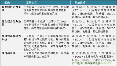 隨著世界范圍的人們對更高能源效率的交通方式的需求增加,HEV/EVs將首當(dāng)其沖,成為人們的首要選擇的交通方式。為了更好的了解電動與混合動力車輛市場的潛力與發(fā)展情況,我們不可避免的要知道在本文中提到的是什么類型的車輛。在Strategy Analytics[1]的報告中:“2007年到2021年混合動力車輛系統(tǒng)的需求預(yù)測,”將HEV/EV分為四類: