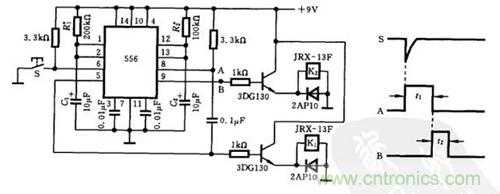 如下是由一片556(雙555)組成的兩級定時器電路,第一級定時器被開關(guān)S觸發(fā)時產(chǎn)生延遲脈沖A驅(qū)動繼電器K1, A的延遲時間 t1 = ~1.1 R1xC 1