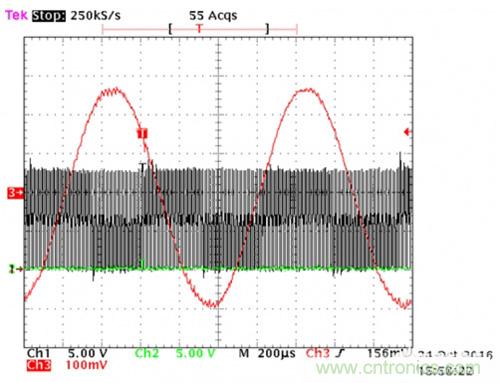 直列式電流感應(yīng)方法看似是最合理的,因?yàn)檫@是最終要測(cè)量的電流。但這種方法存在一個(gè)問(wèn)題。驅(qū)動(dòng)MOSFET或IGBT的PWM信號(hào)對(duì)電流感應(yīng)放大器造成嚴(yán)重破壞。感測(cè)電阻處的共模信號(hào)從電源電壓被驅(qū)動(dòng)到接地,具有非??焖俚乃矐B(tài)開(kāi)關(guān)特性,而電流感應(yīng)放大器試圖測(cè)量感測(cè)電阻本身的小差分信號(hào)。圖2是由PWM逆變器產(chǎn)生的正弦相電流(紅色波形)的示波器截圖。這種情況下,PWM頻率為100兆赫(MHz),由LMG5200 GaN半橋功率級(jí)提供(更多詳細(xì)信息,請(qǐng)參見(jiàn)底部的TI設(shè)計(jì))。需要注意的是,快速開(kāi)關(guān)信號(hào)是直列式電流感應(yīng)放大器測(cè)量相電流時(shí)所接收的信號(hào)。這就像在有颶風(fēng)的情況下,當(dāng)杯子在海上漂浮,而試圖測(cè)量杯中液體一樣。難怪大多數(shù)設(shè)計(jì)師會(huì)考慮使用低側(cè)感應(yīng)!下面我們將介紹另外一種方法。