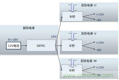 該電源的輸入是新能源乘用車常規(guī)的12V電源,該電源通常波動范圍是8~16V,而驅(qū)動電源的輸出需要相對穩(wěn)定。需要設(shè)計多組寬壓輸入、定壓輸出的隔離電源。本設(shè)計把電源分成兩級:前級電源實現(xiàn)寬壓輸入、定壓輸出功能,后級實現(xiàn)隔離功能,結(jié)構(gòu)見圖1.