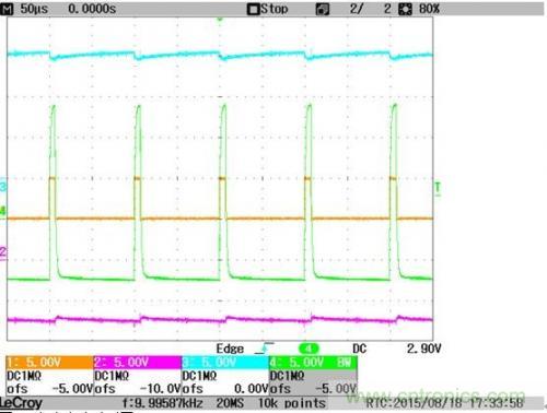 選取高占空比和低占空比兩個工況,觀察相關(guān)信號的波形,見圖4和圖5。其中橙色的1通道顯示低壓側(cè)驅(qū)動輸入信號,粉色2通道顯示-8V電源輸出端的波形,藍色3通道顯示+15V電源輸出端波形,綠色4通道顯示門極輸出波形。