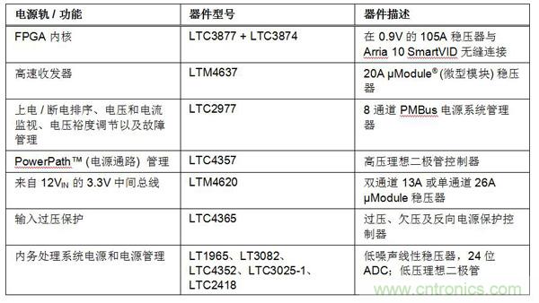 表 1 概述了圖 1 所示 Arria 10 開發(fā)套件電路板的電源軌和功能。該表列出了凌力爾特公司的器件,并描述了每種器件的功能。訪問 www.linear.com.cn/altera,點(diǎn)擊 Arria,了解本文所示兩種電路板的詳細(xì)技術(shù)信息。