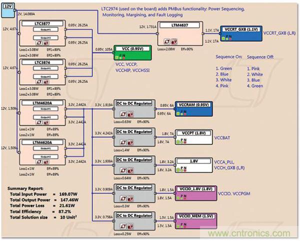 圖 3:用于 Arria 10 GX FPGA 電路板 (圖 1) 的電源樹。用 LTpowerPlanner 設(shè)計(jì),該軟件是一款分析性和簡便易用的初步設(shè)計(jì)工具以用來映射電源要求。