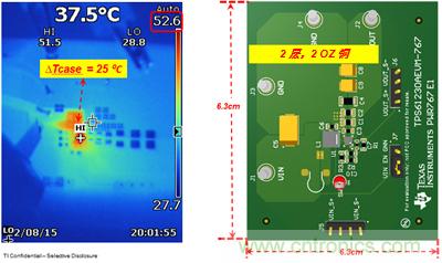 TPS61230A基于谷值限流模式控制方案,最小開關電流為4.8A。該器件集成了兩個低RDS(on)FET(18mΩ/高速,21mΩ/低速),這使其具有更高的效率和更良好的熱性能。在室溫條件下,VIN = 3.6V,VOUT = 5.0V,IOUT = 2.0A時,只能實現(xiàn)25℃的升溫,如圖3所示。