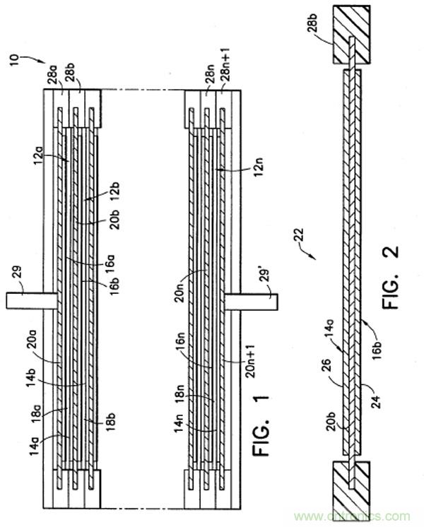 涂層表面上的電流和電勢(shì)達(dá)到更加均勻的分布,因此,采用雙極性cell構(gòu)成的電池具有更高的功率特性。下圖Fig1是一個(gè)典型的由多個(gè)雙極性電池單元構(gòu)成的雙極性鋰離子電池截面圖,F(xiàn)ig2是提取出來的其中一個(gè)雙極性電池單元。其中,12a、12b,…,12n是電池單元;14a、14b,…,14n是電池單元的正極側(cè);16a、16b,…,16n是電池單元的負(fù)極側(cè);18a、18b,…,18n隔膜;20b、20c,…,20n是集流體(例如,F(xiàn)ig2中的14a和16b共用一個(gè)集流體),集流體可采用雙金屬基材,例如,Cu-Al雙金屬,負(fù)極活性物質(zhì)涂敷在Cu側(cè),正極活性物質(zhì)涂敷在Al側(cè);24是負(fù)極活性物質(zhì),26是正極活性物質(zhì);28a、28b,…,28n是絕緣性連接固定結(jié)構(gòu),每個(gè)雙極性電極通過該連接結(jié)構(gòu)固定起來。在Fig1和Fig2中,一共有n-1個(gè)雙極性電極(集流體兩側(cè)分別有正極、負(fù)極活性物質(zhì)),最上層20a只有負(fù)極一側(cè),另一側(cè)跟負(fù)極極柱29相連,最下層20n+1只有正極一側(cè),另一側(cè)跟正極極柱29相連。