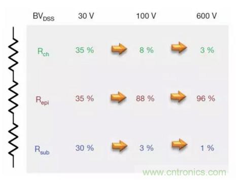 圖2顯示平面式MOSFET情況下構(gòu)成RDS(on) 的各個(gè)分量。對(duì)于低壓MOSFET,三個(gè)分量是相似的。但隨著額定電壓增加,外延層需要更厚和更輕摻雜,以阻斷高壓。額定電壓每增加一倍,維持相同的RDS(on)所需的面積就增加為原來的五倍以上。對(duì)于額定電壓為600V的MOSFET,超過95%的電阻來自外延層。顯然,要想顯著減小RDS(on)的值,就需要找到一種對(duì)漂移區(qū)進(jìn)行重?fù)诫s的方法,并大幅減小epi電阻。