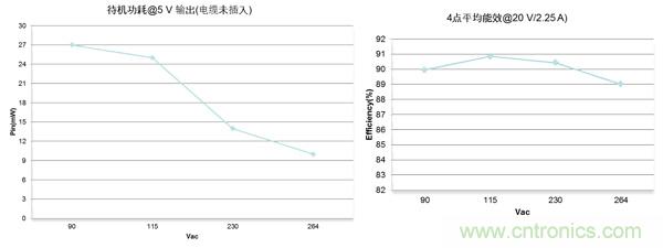 我們?cè)?0 Vac、115 Vac、230 Vac、264 Vac 條件下,測得該方案于5 V輸出(電纜未插入)的待機(jī)功耗都低于27 mW,在評(píng)估板端測得在115 Vac和230 Vac的條件下,20 V/2.25 A輸出的平均能效超過90%。