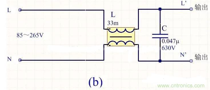 為降低成本和減小體積,開關(guān)電源一般采用簡易的EMI濾波器,主要包括共模扼流圈L和濾波電容,以下四種可以根據(jù)情況進(jìn)行選擇: