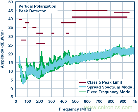 在整個負載范圍內,LT8645S可以輕松符合汽車CISPR25、Class 5峰值EMI限制。還可以使用擴頻頻率調制進一步降低EMI水平(圖2)。LT8645S內置高效率頂部和底部功率開關,并將必要的升壓二極管、振蕩器以及控制和邏輯電路集成到單個芯片中。低紋波突發(fā)工作模式可在低輸出電流下保持高效率,同時使輸出紋波低于10 mV p-p。最后,LT8645S采用小尺寸散熱增強型4 mm×6 mm、32引腳LQFN封裝。