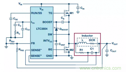 使用RSENSE和DCR兩種檢測(cè)方法時(shí),由于檢測(cè)信號(hào)較小,故均需要開(kāi)爾文檢測(cè)。必須讓開(kāi)爾文檢測(cè)痕跡(圖5中的SENSE+和 SENSE-)遠(yuǎn)離高噪聲覆銅區(qū)和其他信號(hào)痕跡,以將噪聲提取降至最低,這點(diǎn)很重要。某些器件(如LTC3855)具有溫度補(bǔ)償DCR檢測(cè)功能,可提高整個(gè)溫度范圍內(nèi)的精度。