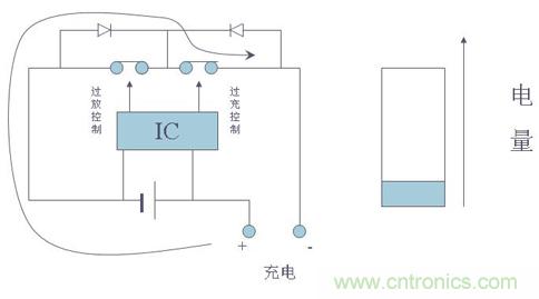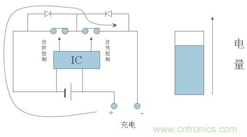 在帶有保護電路的電池中,當控制IC檢測到電池電壓達到4.28V(該值由控制IC決定,不同的IC有不同的值)時,其“CO”腳將由高電壓轉(zhuǎn)變?yōu)榱汶妷海筎1由導(dǎo)通轉(zhuǎn)為關(guān)斷,從而切斷了充電回路,使充電器無法再對電池進行充電,起到過充電保護作用。而此時由于T1自帶的體二極管VD1的存在,電池可以通過該二極管對外部負載進行放電。