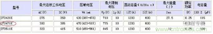 結(jié)合前面所述,來看一下本電路中壓敏電阻的型號(hào)所對(duì)應(yīng)的相關(guān)參數(shù)。
