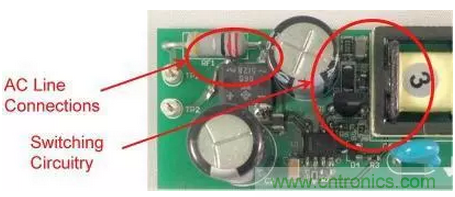 注意,漏極連接與輸入引線之間有一些由輸入電容器提供的屏蔽。該電容器的外殼連接至主接地,可為共模電流提供返回主接地的路徑。如圖2所示,這個(gè)微小的電容會(huì)導(dǎo)致電源EMI簽名超出規(guī)范要求。