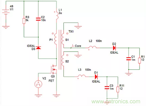 例如,一個(gè)反激式電源可分別從一個(gè)48V輸入產(chǎn)生兩個(gè)1 A的12V輸出,如圖1的簡(jiǎn)化仿真模型所示。理想的二極管模型具有零正向壓降,電阻可忽略不計(jì)。變壓器繞組電阻可忽略不計(jì),只有與變壓器引線串聯(lián)的寄生電感才能建模。這些電感是變壓器內(nèi)的漏電感,以及印刷電路板(PCB)印制線和二極管內(nèi)的寄生電感。當(dāng)設(shè)置這些電感時(shí),兩個(gè)輸出相互跟蹤,因?yàn)楫?dāng)二極管在開(kāi)關(guān)周期的1-D部分導(dǎo)通時(shí),變壓器的全耦合會(huì)促使兩個(gè)輸出相等。